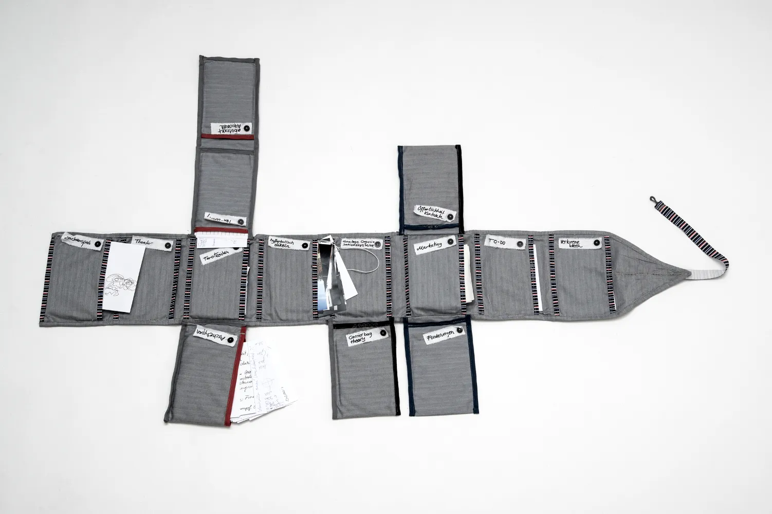 Nodenotes ist ein Werkzeug, mit dem wissenschaftliche und kreative Notizen geordnet werden können. Außerdem kann es zur inhaltlichen Strukturentwicklung für kreative Projekte, sowie in pädagogischem Zusammenhang eingesetzt werden. Es besteht aus einer flexiblen Anzahl an Modultaschen, um Karteikarten, oder Notizzettel im Format DIN A6 unter zu bringen. Diese Module können durch das Einfügen von Papierstreifen in ein durchsichtiges Fach, beschriftet werden. Jedes Modul ist mit vier Reißverschlüssen versehen. Sie besitzen eine quadratische Form, an deren vier Kannten je ein Reißverschluß eingenäht ist. So können die Taschen beliebig miteinander kombiniert und individuell zusammengefalten werden. Es entsteht eine räumliche Gedankenstruktur, in welche die losen Notizen eingeordnet werden. Ein ebenfalls mit einem Reißverschluss adaptierbares Verschlussteil erlaubt es, das ganze Paket zusammenzuschnüren und zu jeder Besprechung, oder als mobilen Schreibtisch an jeden Ort mit zu nehmen.