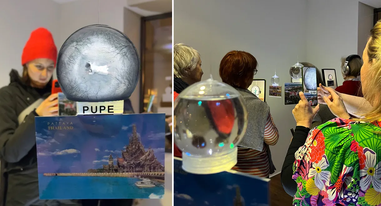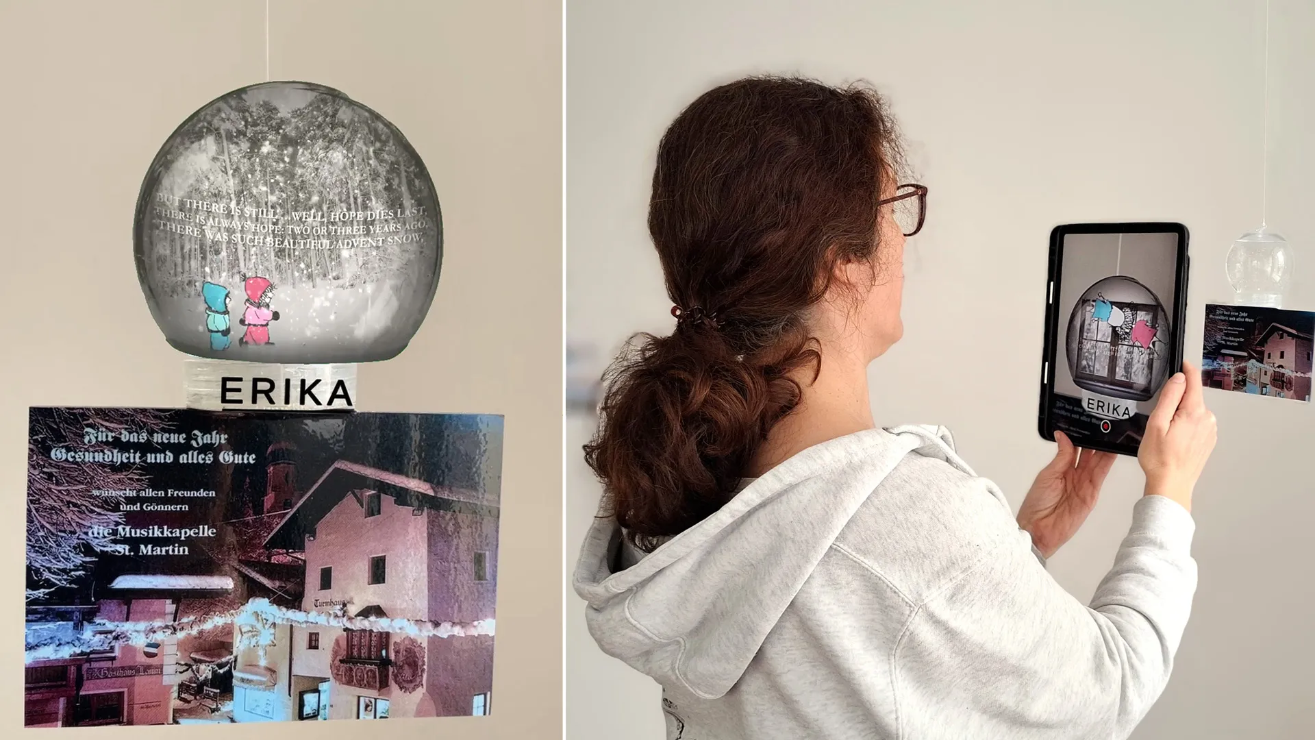 These memories can be experienced in an installation consisting of snow globes filled with water: the starting point is postcard motifs, which serve as markers for virtual snow globes in the AR experience.